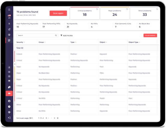 Make a deep scanning of your current ad campaigns with our AI-powered PPC Audit. Get in-depth information about your keywords or PTs performance, overall Semantic Core quality, or other relevant metrics. Besides, the PPC Audit tool greatly synergizes with PPC Automation. In addition, PPC Audit highlights the issues with PPC campaigns, whereas the Automation toll provides solutions to them. To use the PPC Audit tool, just select your product and press scan, no overcomplicated forms to fill. The tool is free to use.